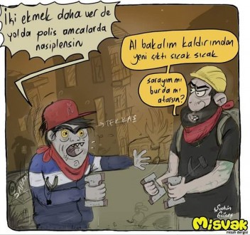 Şahin Güneş imzalı çizimde, Berkin Elvan’ın ekmek değil, polislere atmak için taş aldığı ima ediliyor. Ayrıca kaşlarından çıkarılan bir çizgide “tek kaş” yazılarak çocuğun fiziki görünüşü ile de alay edilmek isteniyor.